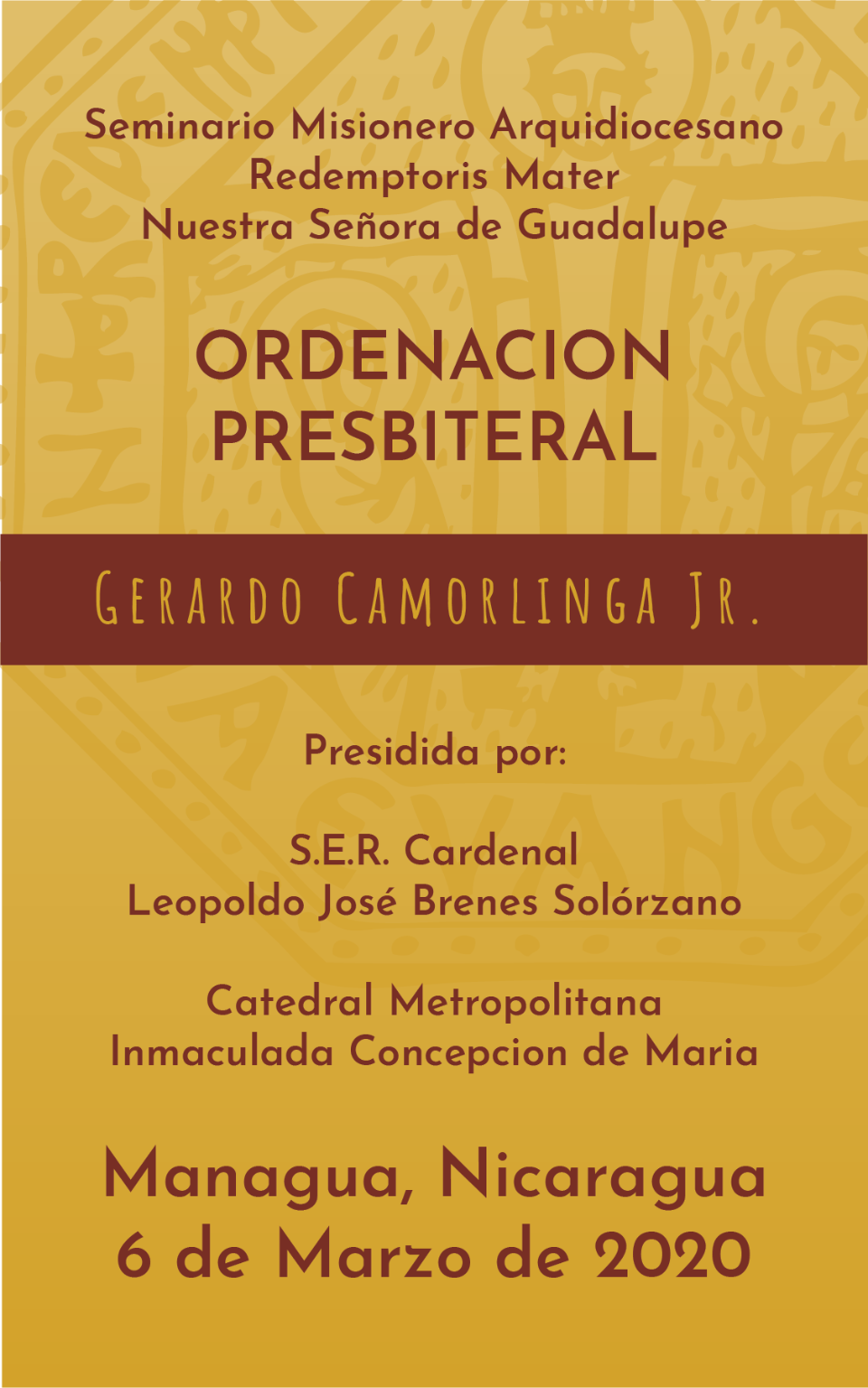 March, 2020An invitation created for Gerardo Camorlinga's ordination in Managua, Nicaragua. The cards were printed front and back and were inspired by Kiko Argüello's "Pantocrator" icon.